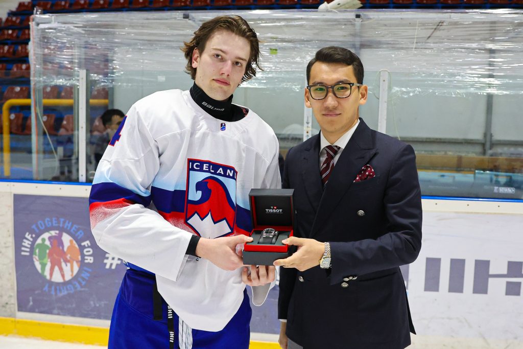 Kári Arnarsson maður mótsins úr liði Íslands tekur við Tissot úri í verðlaun.